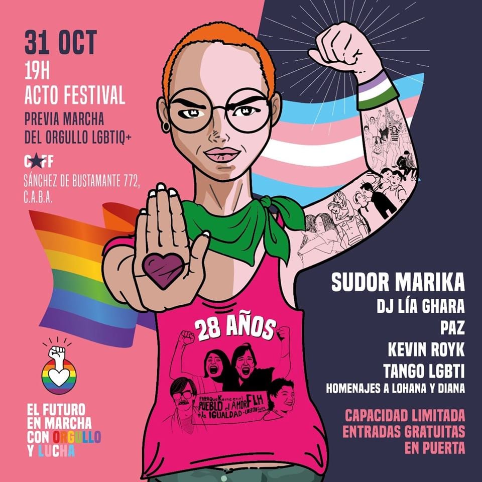 Desde el espacio Orgullo y Lucha, integrado por más de 25 organizaciones LGBTTTI+, realizamos el Acto Festival “¡El futuro en marcha con orgullo y lucha!” el jueves 31 en el Club Atlético Fernández Fierro (CAFF), como instancia previa a la 28° marcha del orgullo.