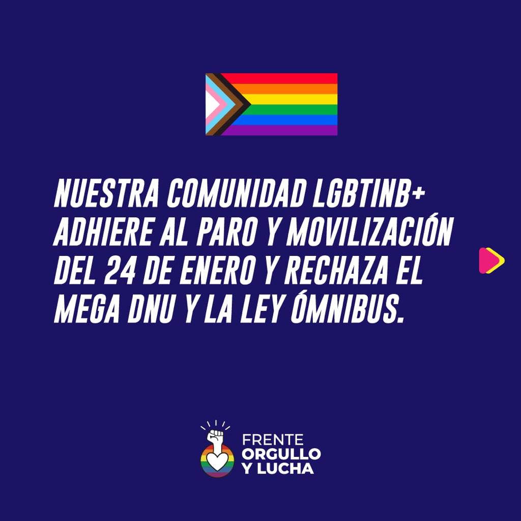 El Frente Orgullo y Lucha adhiere al paro y movilización del 24 de enero en rechazo al mega DNU y a la ley ómnibus.